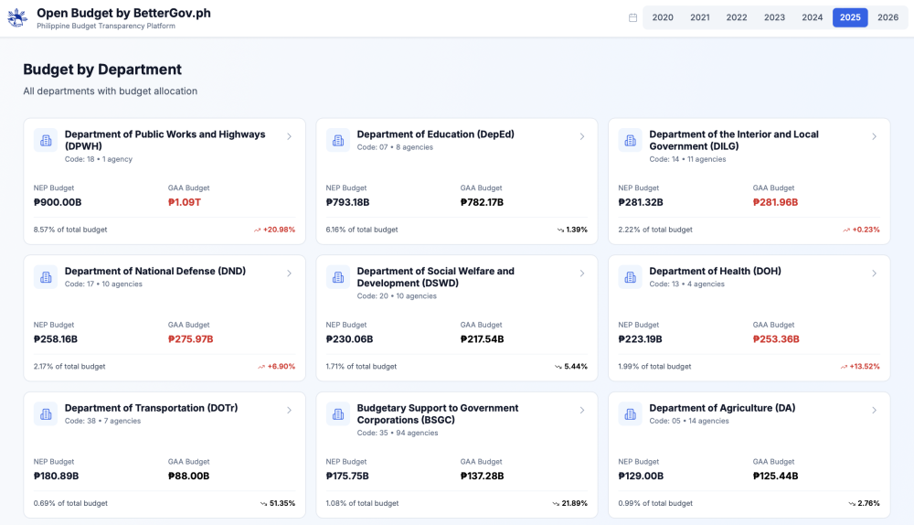 For now, the platform—budget.bettergov.ph—hosts seven years’ worth of Philippine budget data (2020-2026), and shows the allocations per department and per region. For 2020 to 2025, it has been able to track the changes between the NEP and the GAA and computes the amount of insertions made per agency.