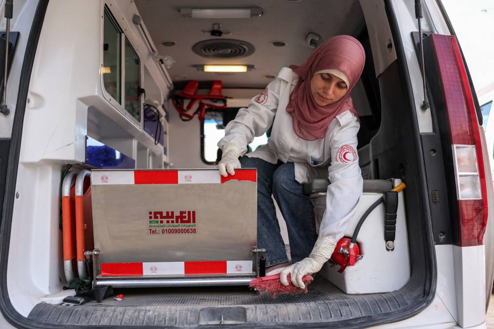 “All of this is psychological pressure on a working woman,” Wafi said, sitting by her ambulance, before scrubbing blood from its floor.