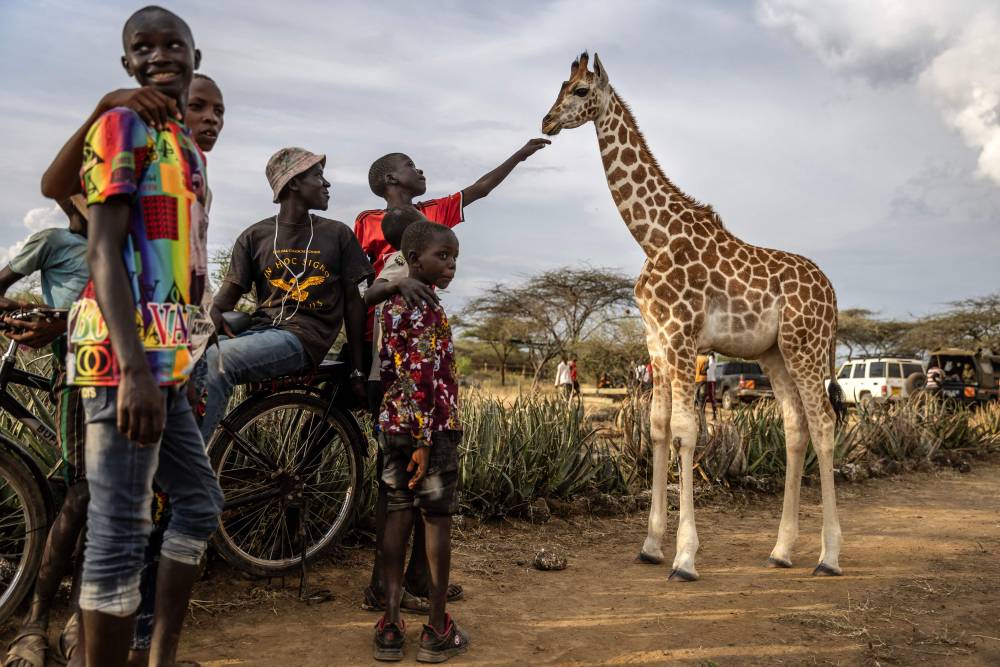 A boy touches a baby giraffe roaming at the community celebrations to honour the arrival of several wild giraffes as part of a wildlife translocation exercise in Ruko Conservancy, on July 7, 2024. In western Kenya, wild giraffes are being relocated to the Ruko Conservancy to keep fostering peace between the historically clashing Pokot and Ilchamus communities. Since the first giraffes’ arrival to the reserve in 2011, poaching has ceased, and community relations have improved, creating jobs and regional stability. Before the giraffes arrival, an intercommunal welcoming ceremony with dancing and singing is held for them, an inconceivable scene in the mid-2000s. (Photo by LUIS TATO / AFP)