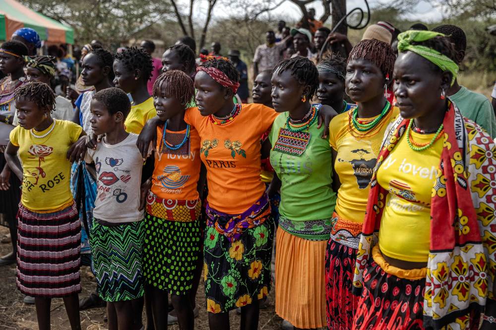 Women wear traditional attires and colourful clothes as they attend the community celebrations to honour the arrival of several wild giraffes as part of a wildlife translocation exercise in Ruko Conservancy, on July 7, 2024. In western Kenya, wild giraffes are being relocated to the Ruko Conservancy to keep fostering peace between the historically clashing Pokot and Ilchamus communities. Since the first giraffes’ arrival to the reserve in 2011, poaching has ceased, and community relations have improved, creating jobs and regional stability. Before the giraffes arrival, an intercommunal welcoming ceremony with dancing and singing is held for them, an inconceivable scene in the mid-2000s. (Photo by LUIS TATO / AFP)