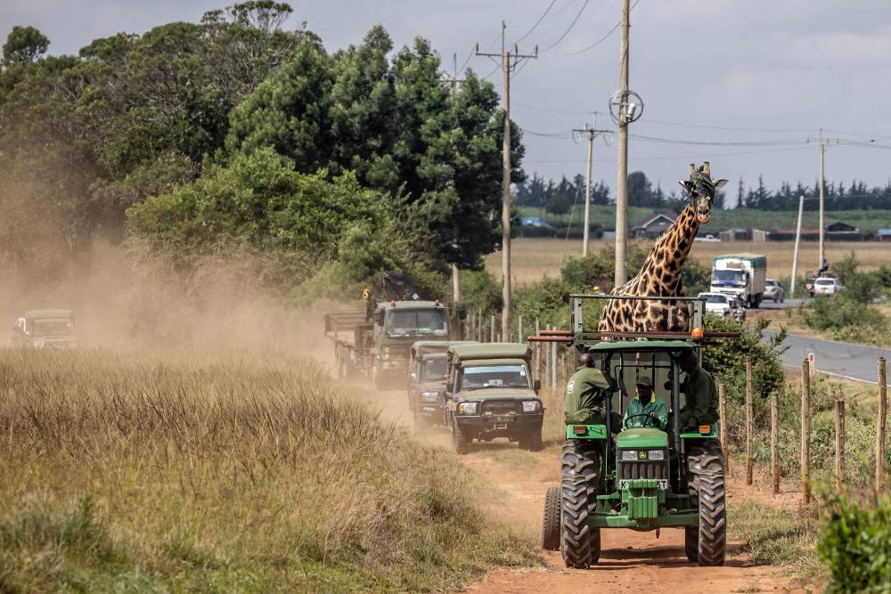 Members of the Kenya Wildlife Service (KWS) drive a tractor attached to a trailer containing a giraffe that has been blindfolded during a translocation exercise for wild giraffes in a farm near Eldoret, on June 24, 2024. In western Kenya, wild giraffes are being relocated to the Ruko Conservancy to keep fostering peace between the historically clashing Pokot and Ilchamus communities. Since the first giraffes’ arrival to the reserve in 2011, poaching has ceased, and community relations have improved, creating jobs and regional stability. Before the giraffes arrival, an intercommunal welcoming ceremony with dancing and singing is held for them, an inconceivable scene in the mid-2000s. (Photo by LUIS TATO / AFP)