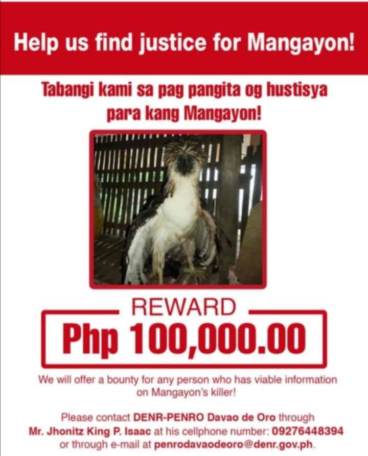 “Help us find justice for Mangayon! We will offer a bounty for any person who has viable information on Mangayon’s killer!” read a social media card released on Monday by the Provincial Environment and Natural Resources Office (Penro) of Davao de Oro which announced the P100,000 reward.
