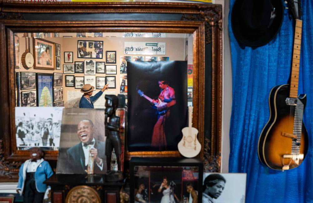 Lorenzo Washington, curator of the Jefferson Street Sound museum looks on at the museum in Nashville, Tennessee on March 15,2024. Country music capital Nashville was once also a hotbed of blues, rock and jazz, thanks to a historically Black neighborhood that brought then-budding greats like Jimi Hendrix to town. But Jefferson Street's vibrant community and its robust club scene faced mid-20th century decimation after the construction of an interstate highway slashed it in two, a classic tale of ruinous urban planning that all but extinguished the neighborhood's rich musical legacy. Washington, a lifelong Nashville resident who grew up in the area, has been vying to keep that history alive, operating a small museum out of his home that's chock-full of music ephemera as well as records and maps exhibiting the district's long-lost vitality. (Photo by SETH HERALD / AFP)