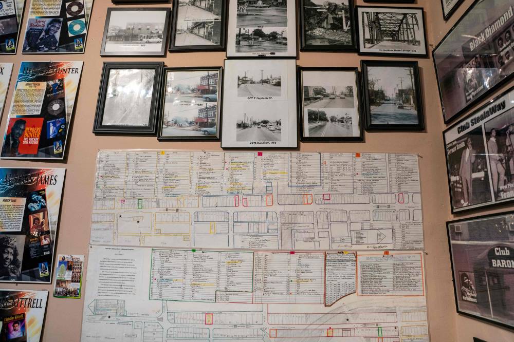 Historic photographs and a map of Jefferson Street is viewed at the Jefferson Street Sound museum in Nashville, Tennessee on March 15, 2024. Country music capital Nashville was once also a hotbed of blues, rock and jazz, thanks to a historically Black neighborhood that brought then-budding greats like Jimi Hendrix to town. But Jefferson Street's vibrant community and its robust club scene faced mid-20th century decimation after the construction of an interstate highway slashed it in two, a classic tale of ruinous urban planning that all but extinguished the neighborhood's rich musical legacy. (Photo by SETH HERALD / AFP)