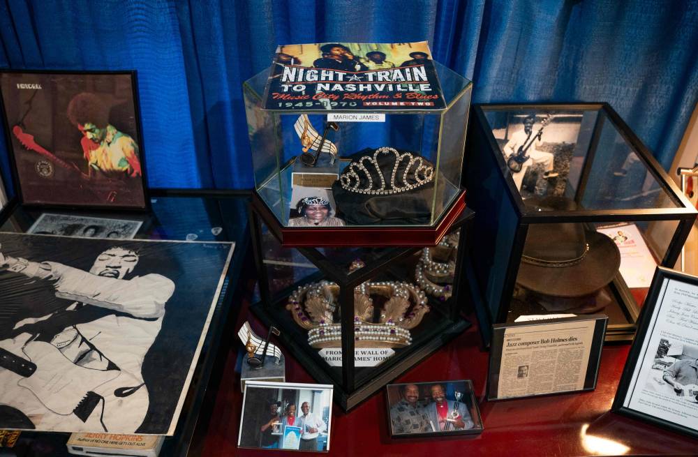 Items that belonged to Marion James is displayed along with other artifacts at the Jefferson Street Sound museum in Nashville, Tennessee on March 15, 2024. Country music capital Nashville was once also a hotbed of blues, rock and jazz, thanks to a historically Black neighborhood that brought then-budding greats like Jimi Hendrix to town. But Jefferson Street's vibrant community and its robust club scene faced mid-20th century decimation after the construction of an interstate highway slashed it in two, a classic tale of ruinous urban planning that all but extinguished the neighborhood's rich musical legacy. (Photo by SETH HERALD / AFP)
