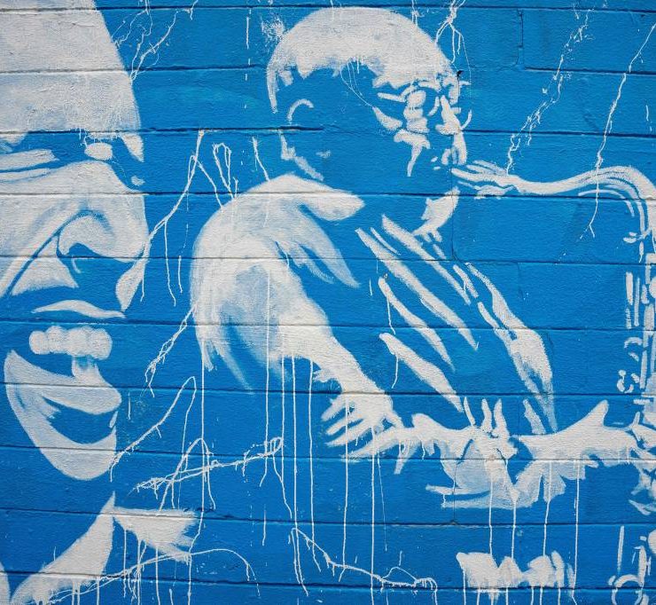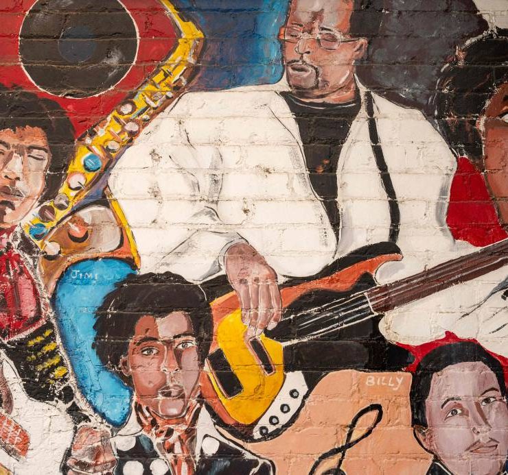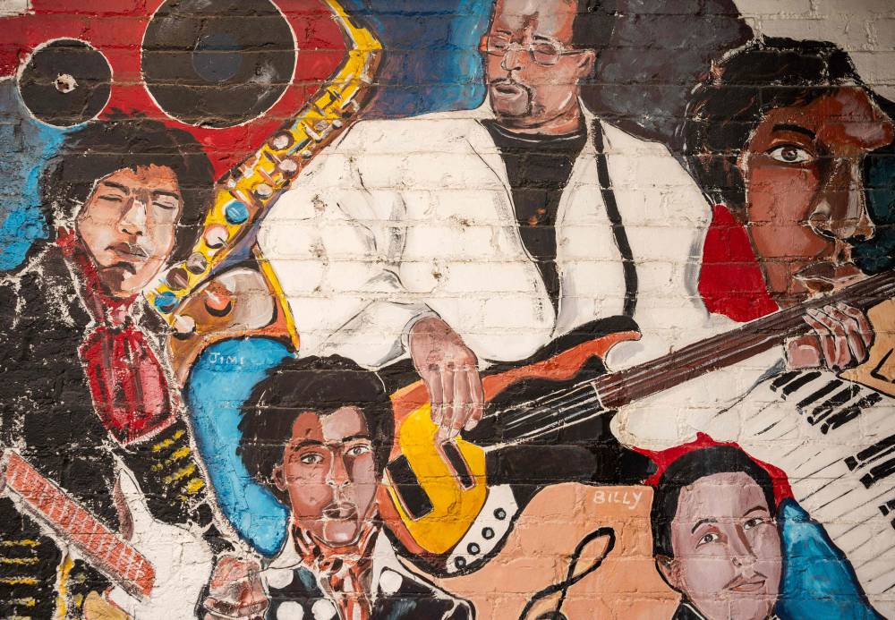 A mural on Jefferson Street in Nashville, Tennessee is viewed on March 15, 2024. Country music capital Nashville was once also a hotbed of blues, rock and jazz, thanks to a historically Black neighborhood that brought then-budding greats like Jimi Hendrix to town. But Jefferson Street's vibrant community and its robust club scene faced mid-20th century decimation after the construction of an interstate highway slashed it in two, a classic tale of ruinous urban planning that all but extinguished the neighborhood's rich musical legacy. (Photo by SETH HERALD / AFP)