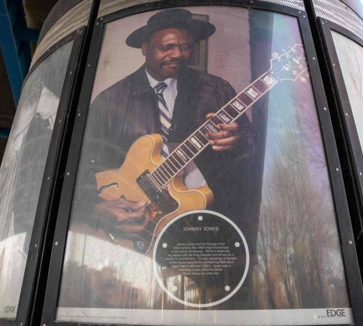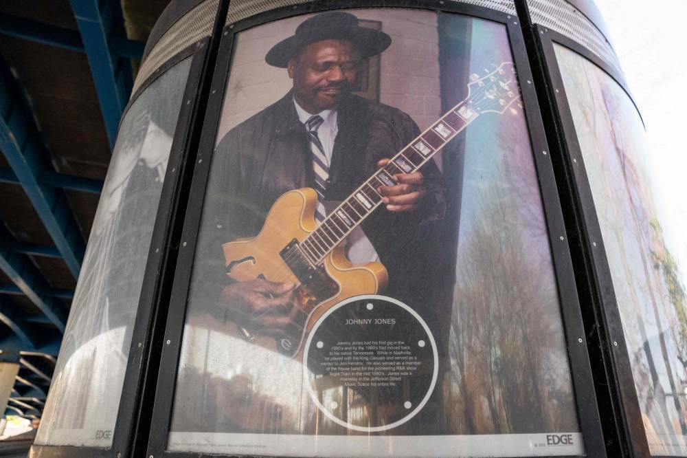 A picture of Johnny Jones who played in clubs along Jefferson Street and was the mentor of Jimi Hendrix is viewed on March 19, 2024 in Nashville, Tennessee. Country music capital Nashville was once also a hotbed of blues, rock and jazz, thanks to a historically Black neighborhood that brought then-budding greats like Jimi Hendrix to town. But Jefferson Street's vibrant community and its robust club scene faced mid-20th century decimation after the construction of an interstate highway slashed it in two, a classic tale of ruinous urban planning that all but extinguished the neighborhood's rich musical legacy. (Photo by SETH HERALD / AFP)