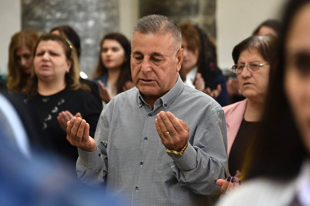 Iraqi Christian worshippers celebrate mass in the 80-year-old Chaldean Catholic Church of Um al-Mauna, "Our Lady of Perpetual Help", in Mosul in northern Iraq on April 5, 2024. With chants and joyous ululations, Iraqi Christians celebrated the restoration of the church on April 5, years after jihadists turned it into a religious police office. (Photo by Zaid AL-OBEIDI / AFP)