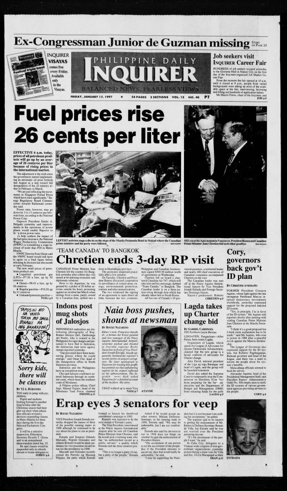 January 17, 1997: Fuel prices rice 26 cents per liter by Philippine Daily Inquirer January 17, 2025 January 17, 1997. 0 Comments