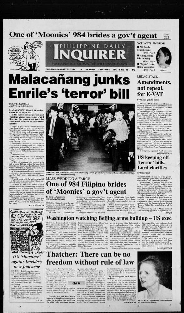 January 25, 1996: Malacañang junks Enrile’s ‘terror’ bill by Philippine Daily Inquirer January 25, 2025 January 25, 1996. 0 Comments