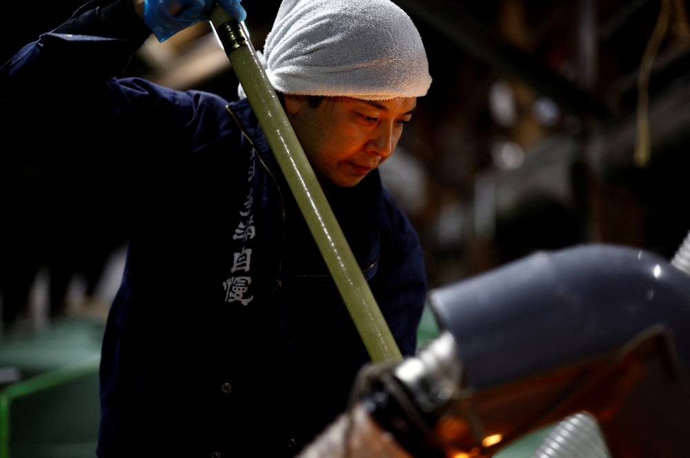 FUSSA, JAPAN—At a Tokyo brewery dating back to the days of the samurai, Koichi Maesako drops a 3-meter-long wooden paddle into a giant, jade-colored tank and gently stirs the white mixture that will turn into sake in a week’s time.