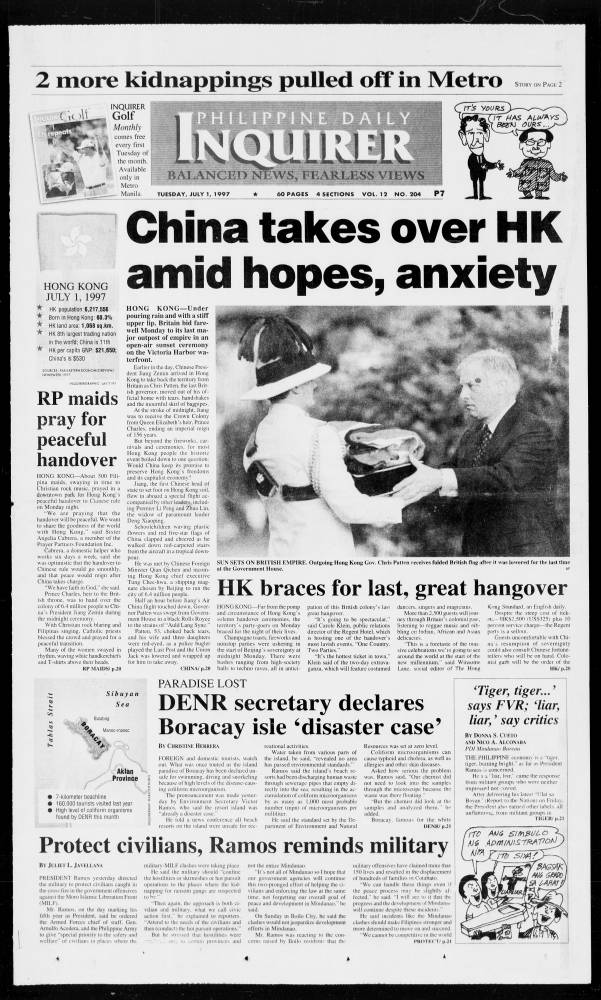 July 1, 1997: China takes over HK amid hopes, anxiety by Philippine Daily Inquirer July 1, 2024 July 1, 1997 0 Comments