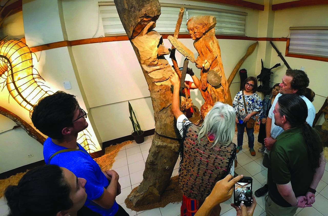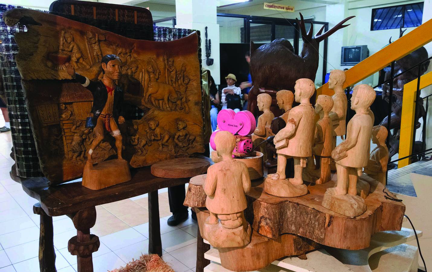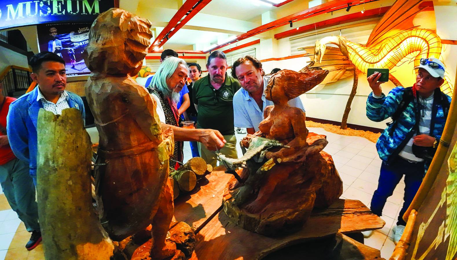 Farther down the room stands a huge sculpture of Rizal whose face blurs and transforms into his “Noli Me Tangere” protagonist Crisostomo Ibarra. The Rizal statue locks eyes with a hooded wolf which represents his novel’s villain, Padre Damaso, Kidlat explained to American documentarian Brandon Hull who attended the exhibit. These images were carved out of narra trunks by Ifugao woodcarver Dehon Taguyungon.