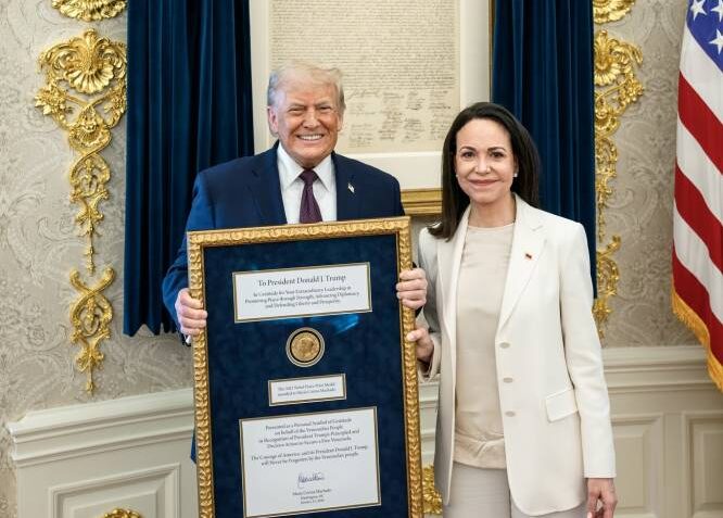 The White House later posted a photo of Machado standing next to Trump in the Oval Office as he holds the medal in a large frame. A text in the frame reads, “Presented as a personal symbol of gratitude on behalf of the Venezuelan people in recognition of President Trump’s principled and decisive action to secure a free Venezuela.”