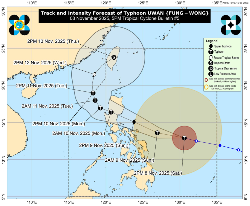 Pagasa said Uwan was forecast to move west-northwest on Saturday and Sunday before moving more northwestward on Monday. Uwan’s center was seen to pass close to Catanduanes on Sunday morning and make landfall over the southern portion of Isabela or the northern portion of Aurora, on Sunday evening or on Monday early morning.