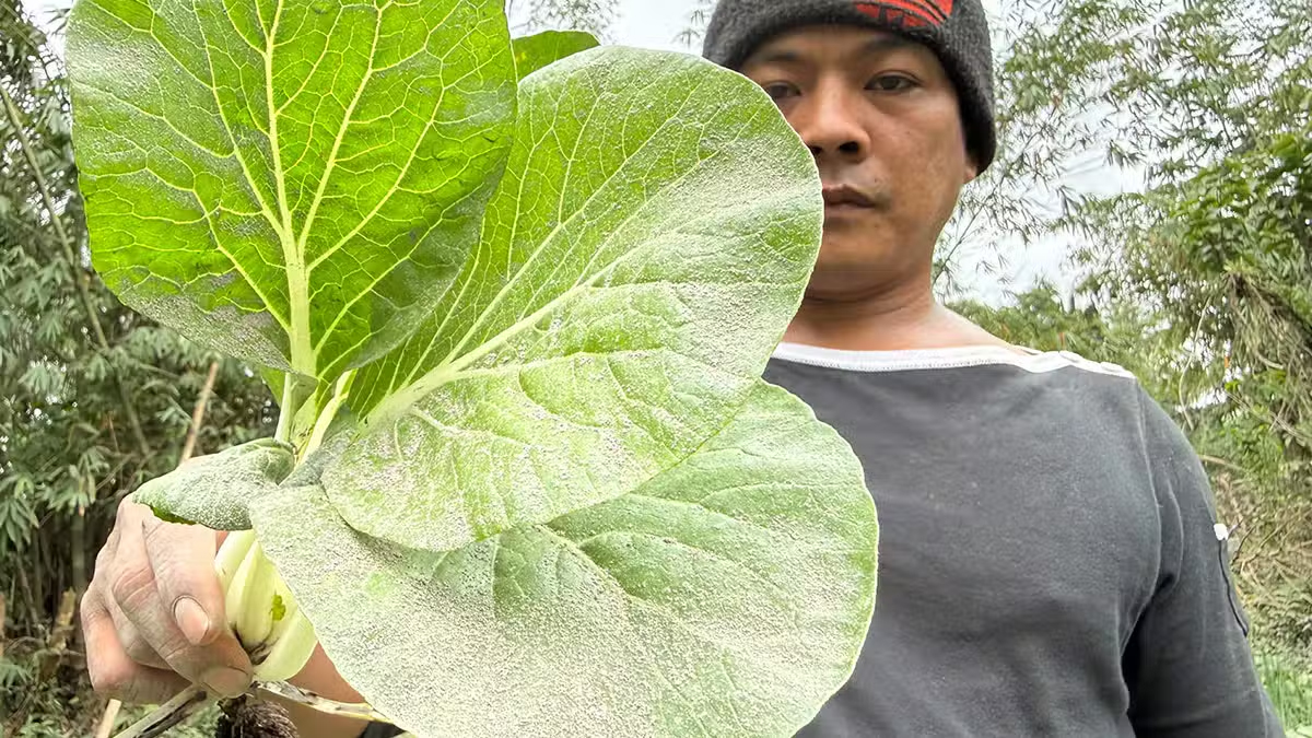 CROPS IN PERIL A Camalig resident holds pechay leaves covered in volcanic ash after Mayon Volcano’s largest pyroclastic density current this year swept through Albay towns on Monday, threatening local crops and farmers’ livelihoods. —MICHAEL B. JAUCIAN