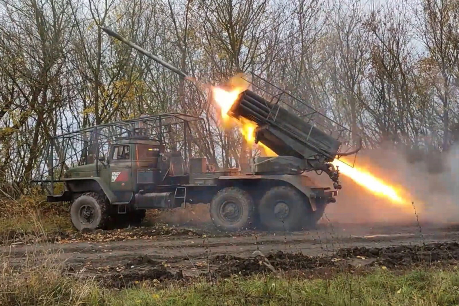 In this photo taken from video released by the Russian Defense Ministry on Tuesday, Dec. 3, 2024, a "Grad" self-propelled 122 mm multiple rocket launcher fires toward Ukranian position in the Russian - Ukranian border area in the Kursk region, Russia. (Russian Defense Ministry Press Service photo via AP)