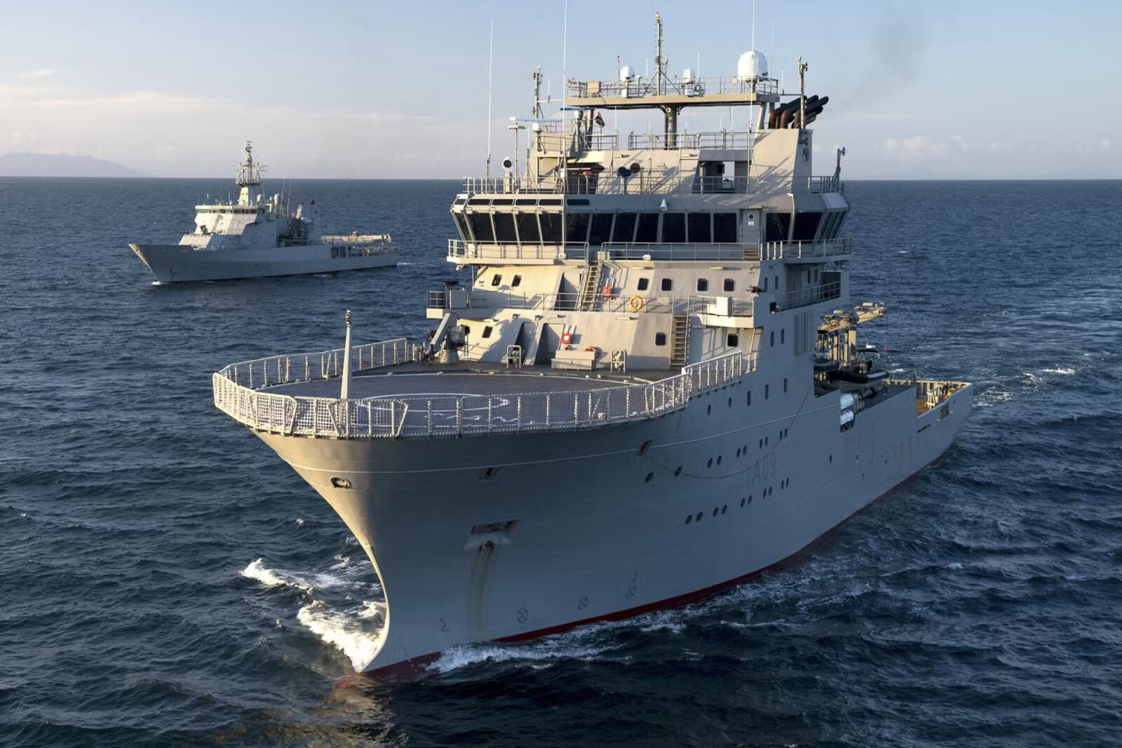 A handout photo taken on April 29, 2020 and obtained from the New Zealand Defense Force on October 6, 2024 shows the Royal New Zealand Navy ship the HMNZS Manawanui (R) in front of HMNZS Otago during a training exercise. —FILE PHOTO/AFP