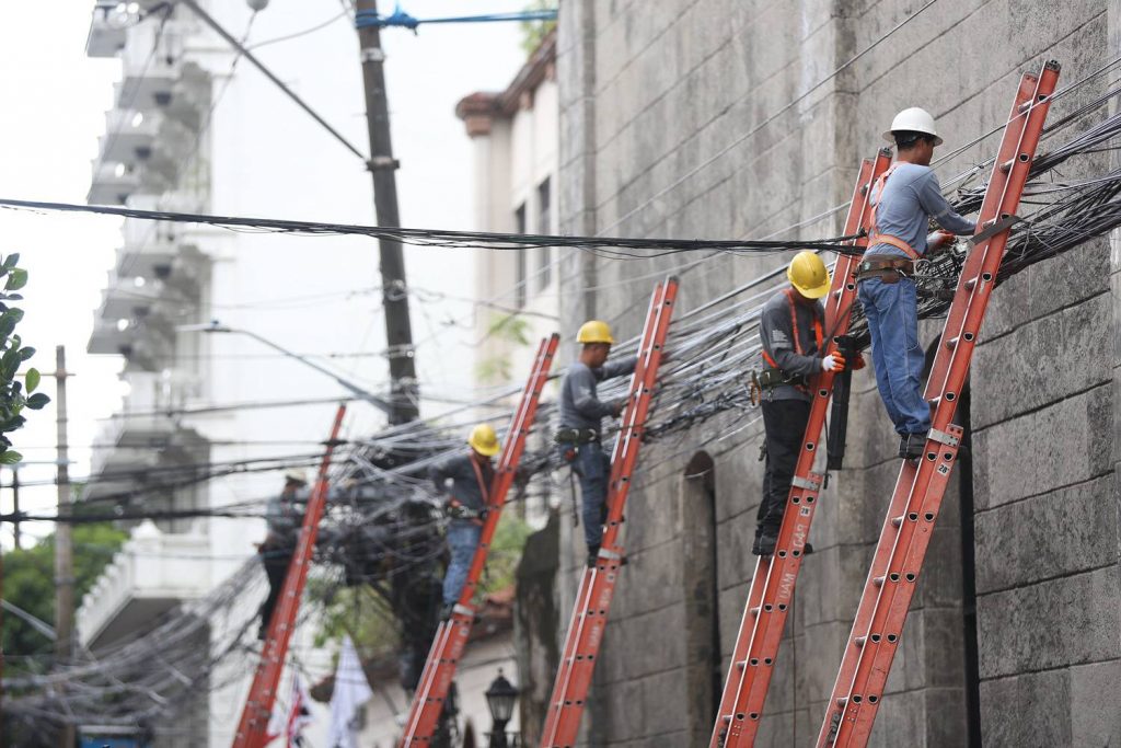 Workers secure or remove dangling utility cables that may pose safety hazards in Intramuros, Manila, on Thursday, as part of the anti-urban blight initiative between the Metropolitan Manila Development Authority and Meralco. —NIÑO JESUS ORBETA