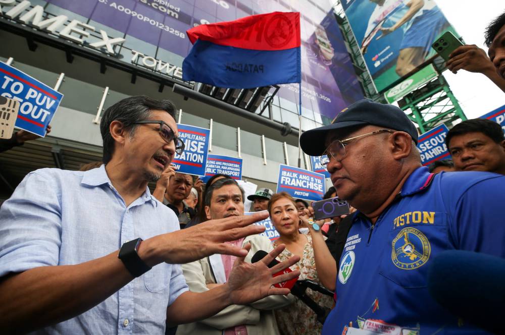RUNNING CONTROVERSY Transportation Secretary Vince Dizon meets with Mody Floranda, president of transport group Piston, during a picket by the group outside the Department of Transportation headquarters on Friday. Since his appointment in February, Dizon has sought to accommodate the concerns of commuters. But the jeepney modernization program being pushed by President Marcos since 2022 has proved too complicated that even a labor coalition like the Trade Union Congress of the Philippines has stepped in, urging Dizon to “heed … our transport groups” as they cope with the cost of modernization. —LYN RILLON