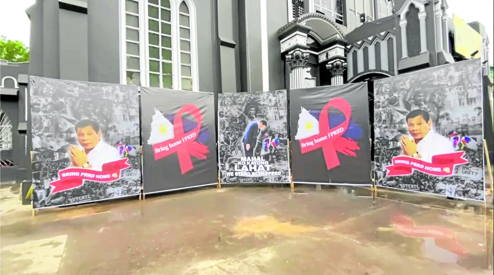 FALLOUT OVER DU30 ARREST The front view of St. Augustine Metropolitan Cathedral is blocked by signs expressing support for Rodrigo Duterte. The city’s archdiocese on Wednesday denied reports that it recently held a “special Mass” for the detained former president. Amid the controversy over Duterte’s arrest on March 11 and his transport to the International Criminal Court in The Hague, the Netherlands, Philippine National Police officials led by its chief Gen. Rommel Marbil appear on Thursday before the Senate committee on foreign relations led by Sen. Imee Marcos, who has criticized the conduct of the arrest and continues to associate herself with the Dutertes, the estranged allies of her brother, President Marcos. According to some international reports on the developments in the Philippines, the country has become a captive audience in a high-stakes game among its dynasts. The country’s law enforcers, who also come from humble origins, are also caught up in this episode by their own police mandate. —SCREEN GRAB FROM JOYLEEN BALABA’S FACEBOOK AND PHOTO BY NIÑO JESUS ORBETA