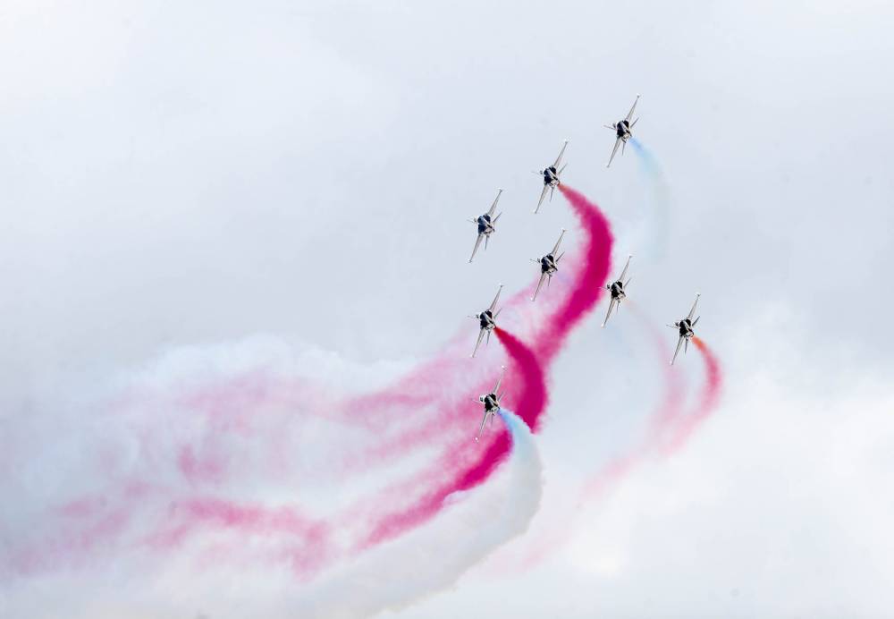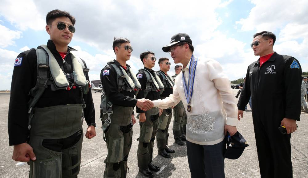 NOT BLACKPINK BUT BLACK EAGLES South Korea’s T-50B supersonic trainer jets perform a half hour of aerial stunts on Sunday during the first of three air shows by the Black Eagles, the popular name of the 53rd Air Demonstration Group of the Republic of Korea Air Force. The event held at Clark Air Base in Pampanga drew cheers from defense and military officials, Korean Embassy officials and defense exhibitors who made up the audience, as the jets made the skies their canvas, drawing a giant heart and other figures with their smoke trails. Korean Ambassador to the Philippines Lee Sang-hwa met with the Black Eagles (below) after their performance to congratulate them. The two more air shows held on Monday and Tuesday were open to the public. -LYN RILLON