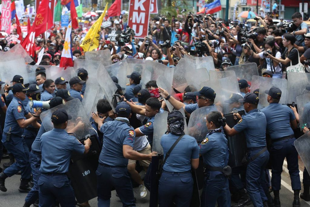 Antiriot police block activists holding a Labor Day rally outside the US Embassy in Manila. The rally turned into a clash between police and protesters, two traditionally opposing forces of the same social class. Six of the ralliers were “illegally arrested,” according to activist groups now calling for their release.