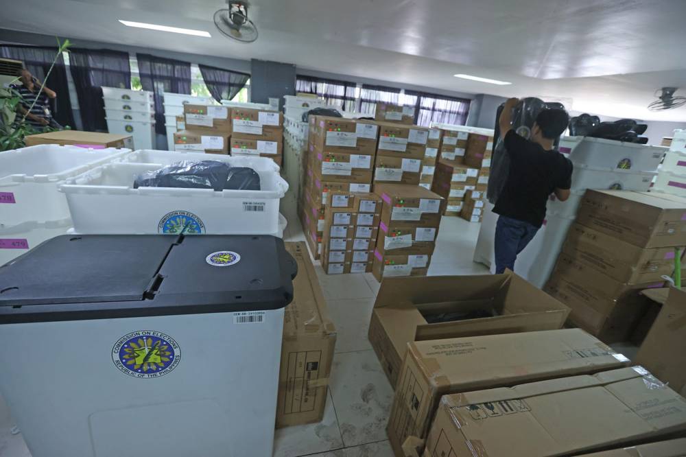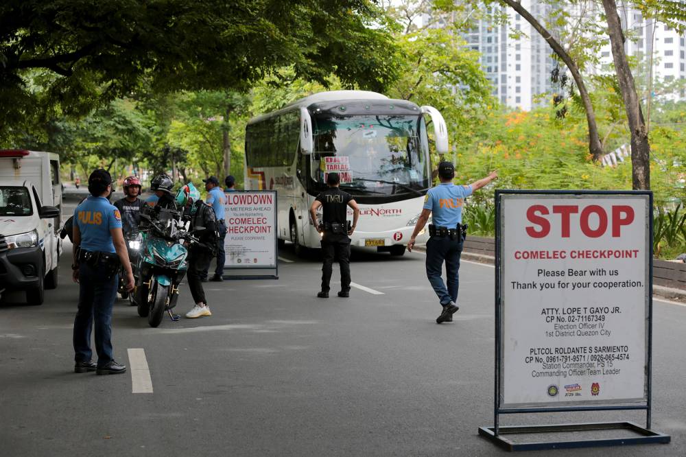 READY FOR THE POLLS The Philippine National Police begins setting up checkpoints on Saturday, nine days ahead of the May 12 midterm elections, while the Commission on Elections prepares to transport vote-counting machines and other equipment (left) to classrooms, basketball courts and other areas that will serve as polling places on Election Day. —GRIG C. MONTEGRANDE, NIÑO JESUS ORBETA