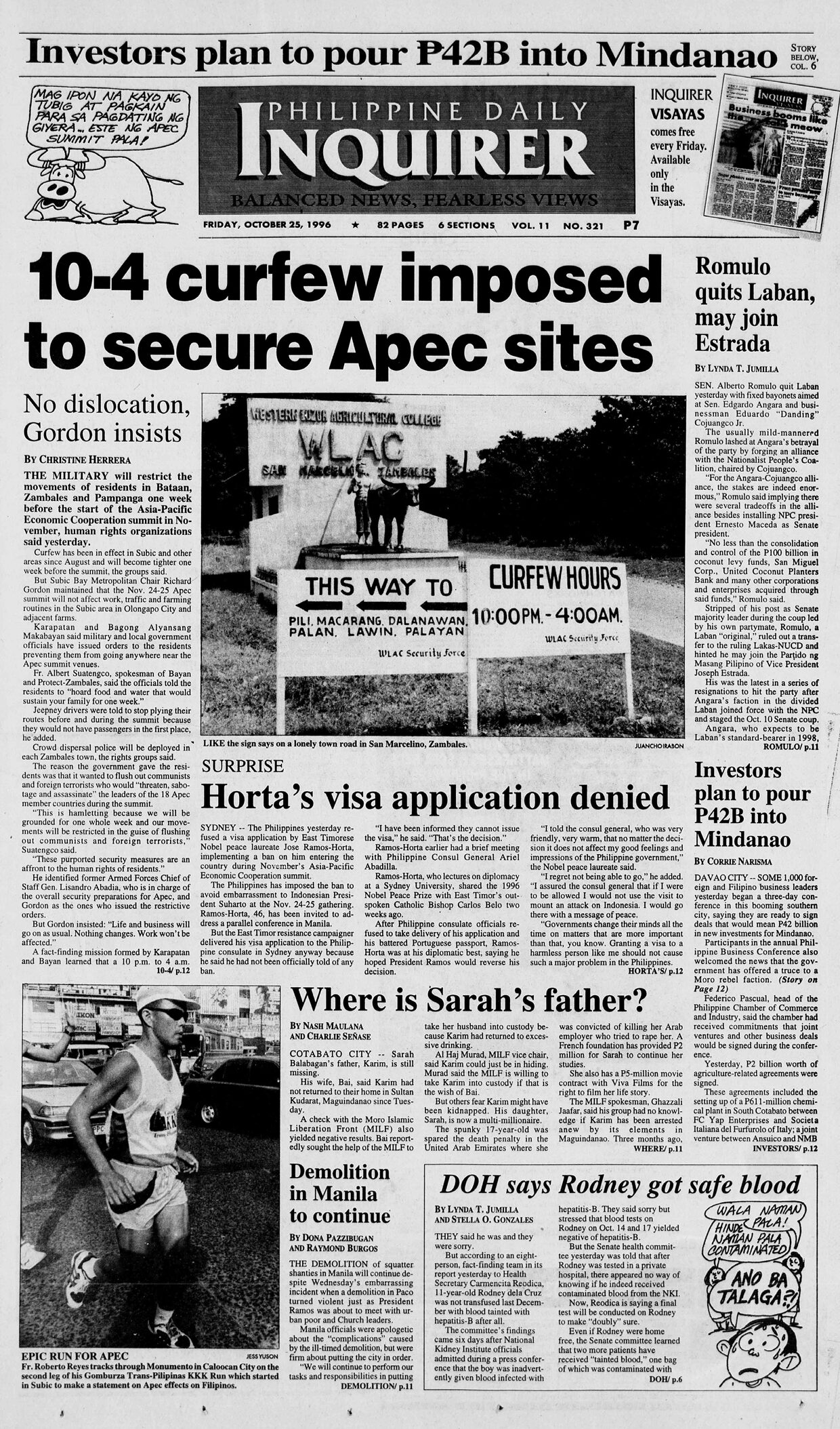 October 25, 1996: 10-4 curfew imposed to secure Apec sites by Philippine Daily Inquirer October 25, 2025