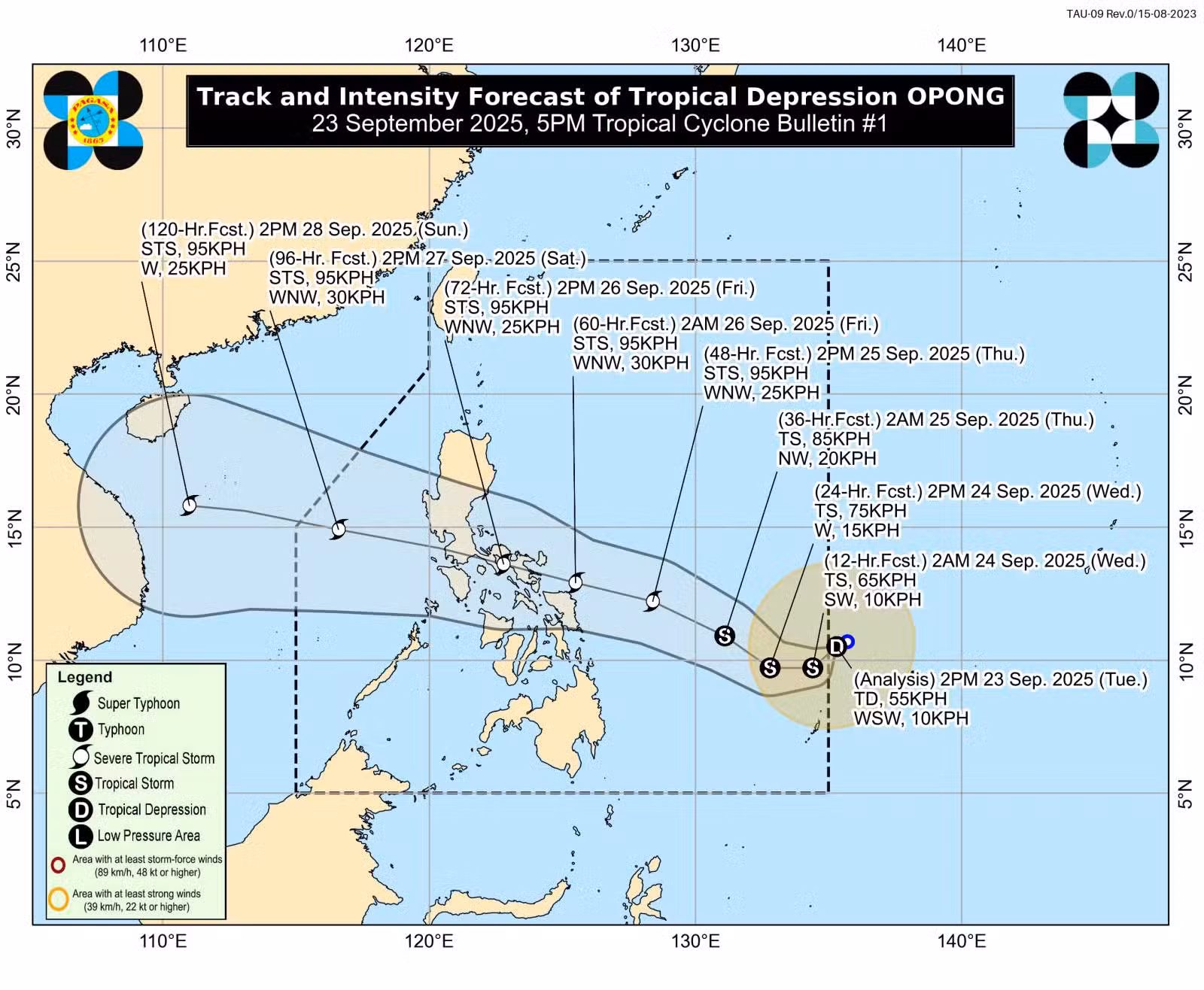 At 4 p.m., Opong was located around 1,045 kilometers east of northeastern Mindanao and moving west-southwestward at 10 kilometers per hour (kph). It has maximum sustained winds of 55 kph and gustiness of up to 70 kph.