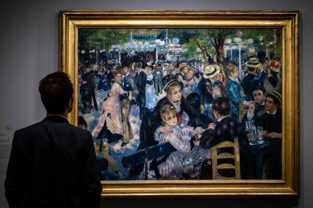 A visitor looks at the painting "Bal du Moulin de la Galette" (Dance at Le Moulin de la Galette - 1876) by French impressionist painter Auguste Renoir" (1841-1919), during a visit of the exhibition 'Paris 1874 Inventing Impressionism' at the Musee d'Orsay in Paris on March 22, 2024, as 150 years ago, on April 15, 1874, the first impressionist exhibition opened in Paris. 'Paris 1874' reviews the circumstances that led the 31 artists exhibited (only seven of whom are well-known across the world today) to join forces and exhibit their works together. (Photo by MIGUEL MEDINA / AFP)