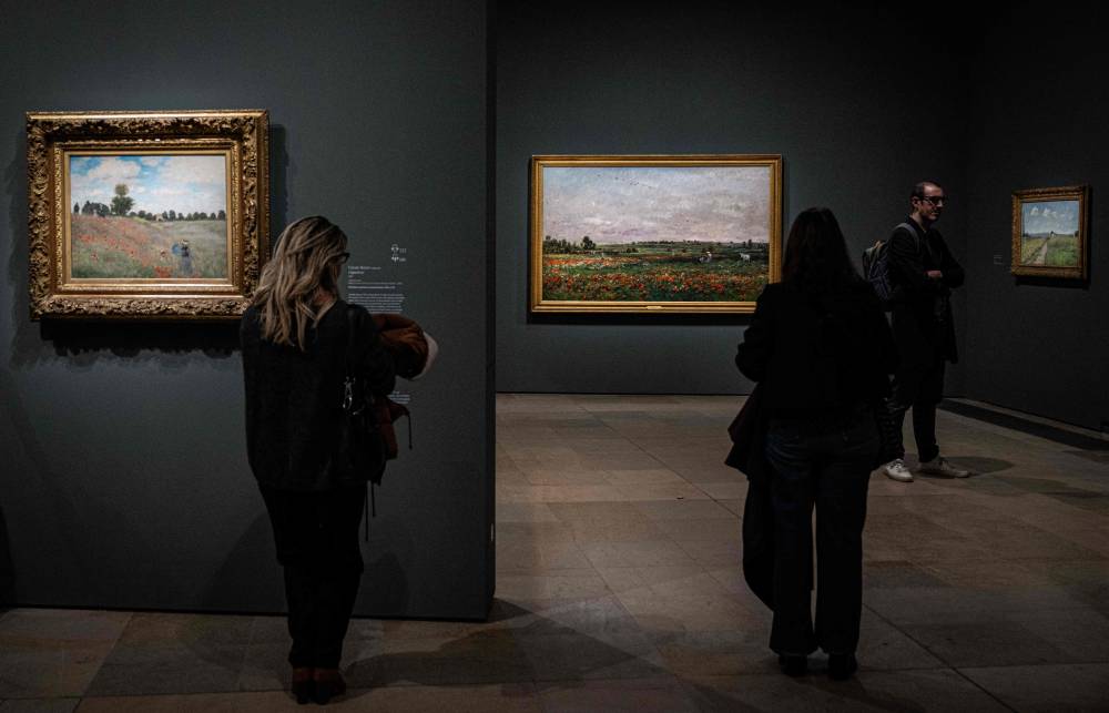 A visitor looks at the painting "Coquelicots" (L) (Poppy Field - 1873) by French impressionist painter Claude Monet (1840-1926), during a visit of the exhibition 'Paris 1874 Inventing Impressionism' at the Musee d'Orsay in Paris on March 22, 2024, as 150 years ago, on April 15, 1874, the first impressionist exhibition opened in Paris. 'Paris 1874' reviews the circumstances that led the 31 artists exhibited (only seven of whom are well-known across the world today) to join forces and exhibit their works together. (Photo by MIGUEL MEDINA / AFP)