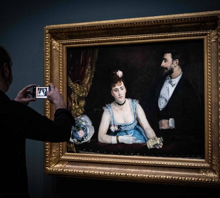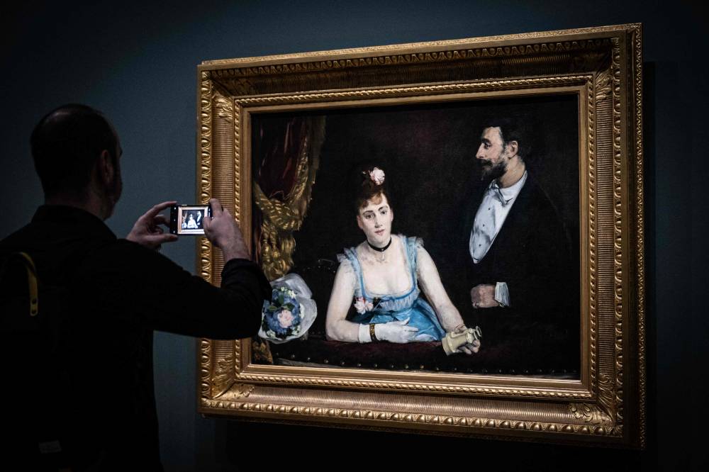 A visitor takes a photograph of the painting "Une Loge aux Italiens" (A Loge at the Theatre des Italiens - around 1874) by French impressionist painter Eva Gonzales (1847-1883), during a visit of the exhibition 'Paris 1874 Inventing Impressionism' at the Musee d'Orsay in Paris on March 22, 2024, as 150 years ago, on April 15, 1874, the first impressionist exhibition opened in Paris. 'Paris 1874' reviews the circumstances that led the 31 artists exhibited (only seven of whom are well-known across the world today) to join forces and exhibit their works together. (Photo by MIGUEL MEDINA / AFP)