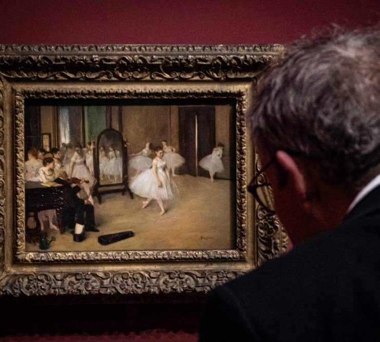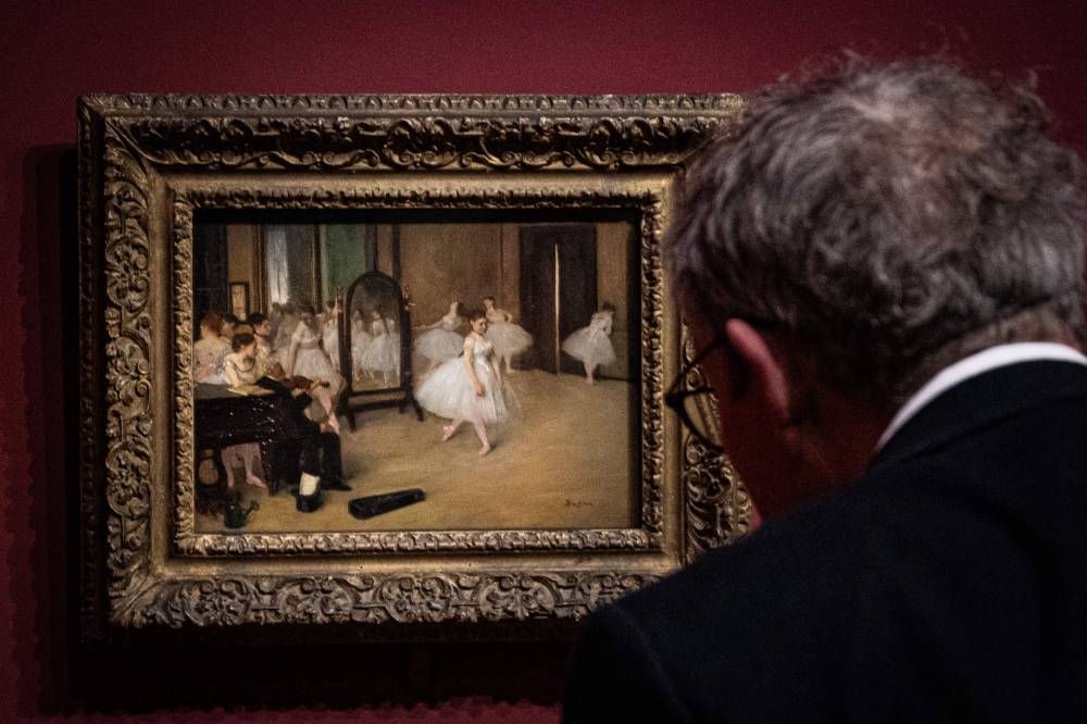 A visitor stands in front of the painting "La Classe de Danse" (The Ballet Class - 1871) by French impressionist painter Edgar Degas (1834-1917), during a visit of the exhibition 'Paris 1874 Inventing Impressionism' at the Musee d'Orsay in Paris on March 22, 2024, as 150 years ago, on April 15, 1874, the first impressionist exhibition opened in Paris. 'Paris 1874' reviews the circumstances that led the 31 artists exhibited (only seven of whom are well-known across the world today) to join forces and exhibit their works together. (Photo by MIGUEL MEDINA / AFP)
