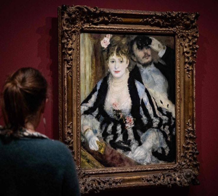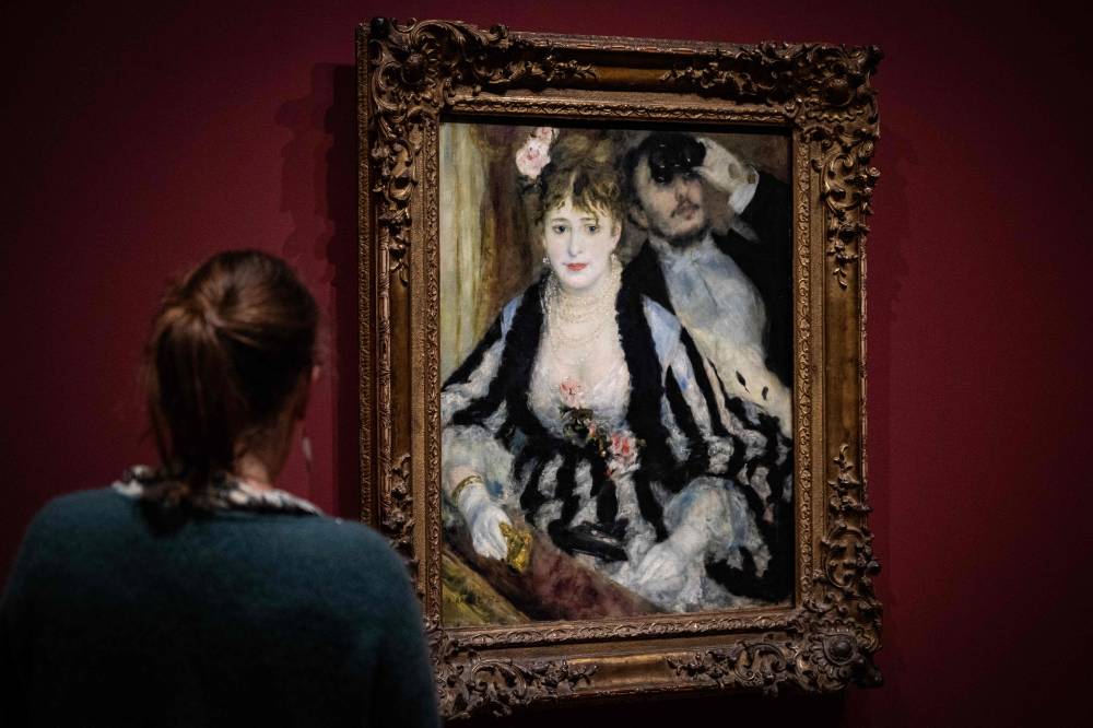 A visitor stands in front of the painting "La Loge" (The Theatre Box - 1874) by French impressionist painter Auguste Renoir (1841-1919), during a visit of the exhibition 'Paris 1874 Inventing Impressionism' at the Musee d'Orsay in Paris on March 22, 2024, as 150 years ago, on April 15, 1874, the first impressionist exhibition opened in Paris. 'Paris 1874' reviews the circumstances that led the 31 artists exhibited (only seven of whom are well-known across the world today) to join forces and exhibit their works together. (Photo by MIGUEL MEDINA / AFP)