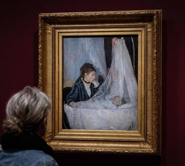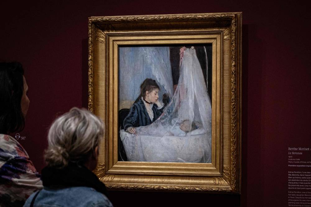 Visitors stand in front of the painting "Le Berceau" (The Cradle - 1872) by French impressionist painter Berthe Morisot (1841-1895), during a visit of the exhibition 'Paris 1874 Inventing Impressionism' at the Musee d'Orsay in Paris on March 22, 2024, as 150 years ago, on April 15, 1874, the first impressionist exhibition opened in Paris. 'Paris 1874' reviews the circumstances that led the 31 artists exhibited (only seven of whom are well-known across the world today) to join forces and exhibit their works together. (Photo by MIGUEL MEDINA / AFP)