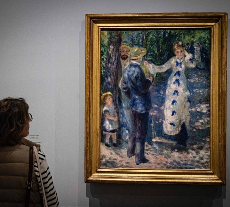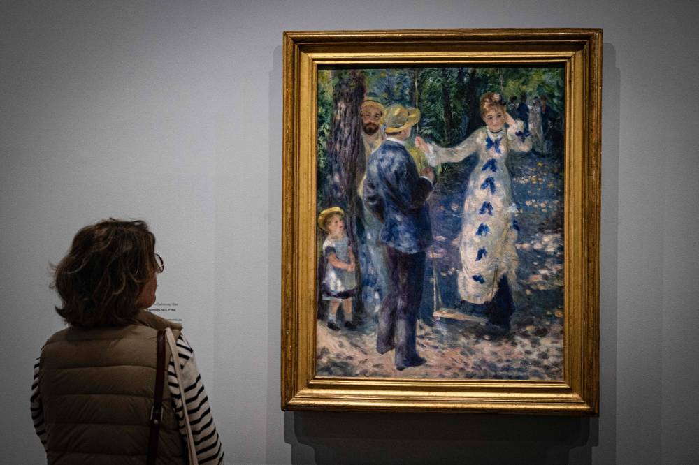 A visitor looks at the painting "La Balancoire" (The Swing - 1876) by French impressionist painter Auguste Renoir" (1841-1919), during a visit of the exhibition 'Paris 1874 Inventing Impressionism' at the Musee d'Orsay in Paris on March 22, 2024, as 150 years ago, on April 15, 1874, the first impressionist exhibition opened in Paris. 'Paris 1874' reviews the circumstances that led the 31 artists exhibited (only seven of whom are well-known across the world today) to join forces and exhibit their works together. (Photo by MIGUEL MEDINA / AFP)