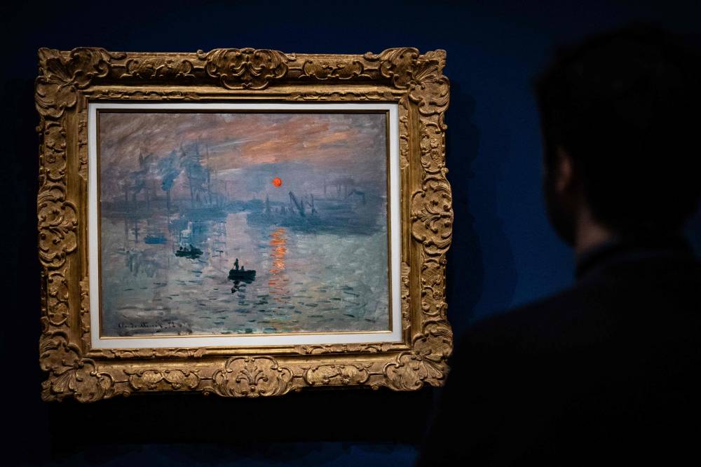 A man stands in front of the painting "Impression, Soleil levant" (Impression, Sunrise - 1872) by French impressionist painter Claude Monet (1840-1926), during a visit of the exhibition 'Paris 1874 Inventing Impressionism' at the Musee d'Orsay in Paris on March 22, 2024, as 150 years ago, on April 15, 1874, the first impressionist exhibition opened in Paris. 'Paris 1874' reviews the circumstances that led the 31 artists exhibited (only seven of whom are well-known across the world today) to join forces and exhibit their works together. (Photo by MIGUEL MEDINA / AFP)