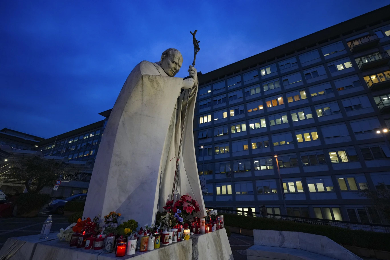 A statue of Pope John Paul II is seen in front of the Agostino Gemelli Polyclinic, Rome, where the Pontiff is hospitalized since Feb 14. (AP Photo/Andrew Medichini)