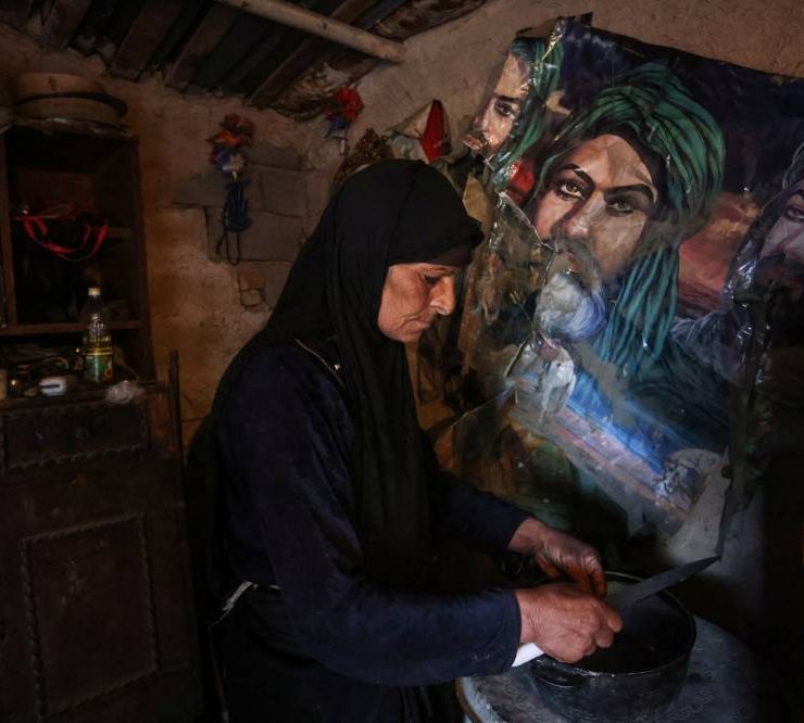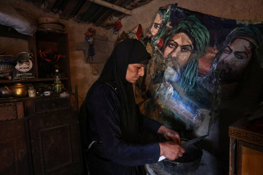 Zahra Jouda Darraj, 51, prepares food for Iftar (fast-breaking meal) in the kitchen next to a photo of the holy Shiite Imams, Imam Ali, the cousin and son-in-law of Prophet Mohammad, and his sons Imam Hussein and Imam Abbas, during the holy month of Ramadan at her makeshift house in the Zaafaraniyah district, Baghdad, Iraq, March 17, 2024. REUTERS/Ahmed Saad