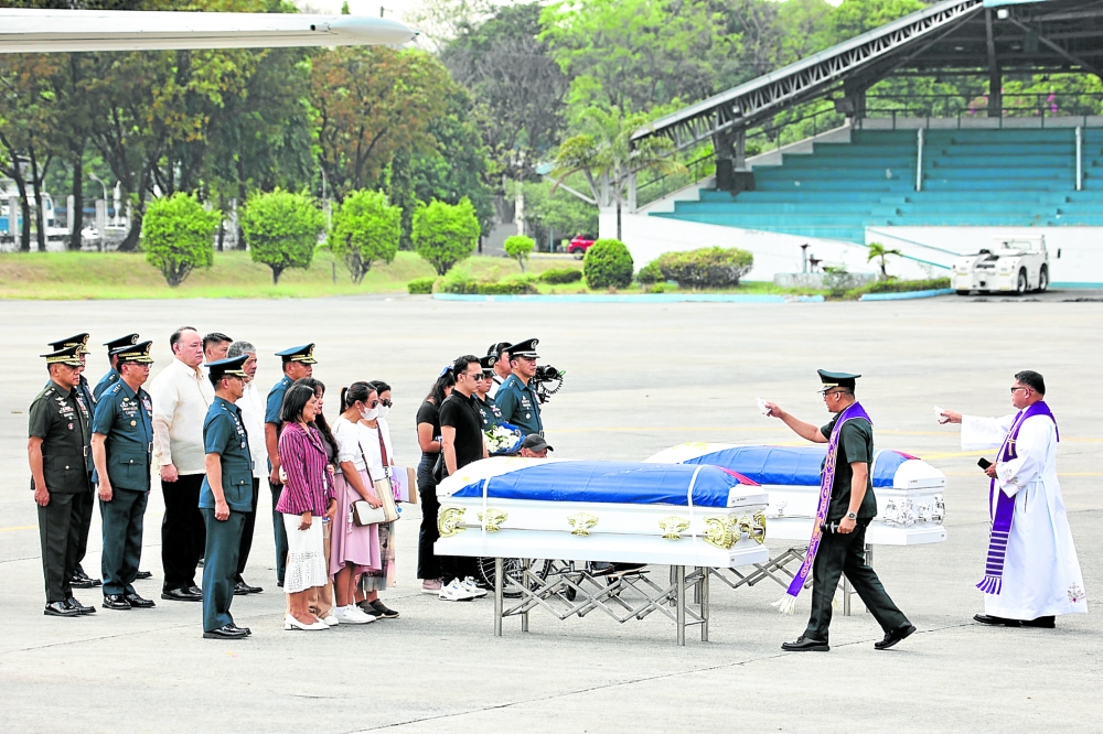 The flag-draped caskets of Maj. Jude Salang-oy and 1st Lt. April John Dadulla arrived at the Villamor Air Base via a C-130 aircraft at about 3 p.m.