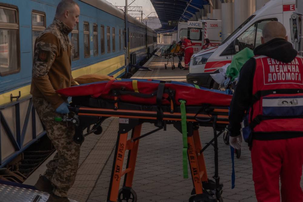 Ambulances arrived at the station carrying dozens of wounded troops who were then hauled onto the train on stretchers and settled on beds with floral-patterned sheets.