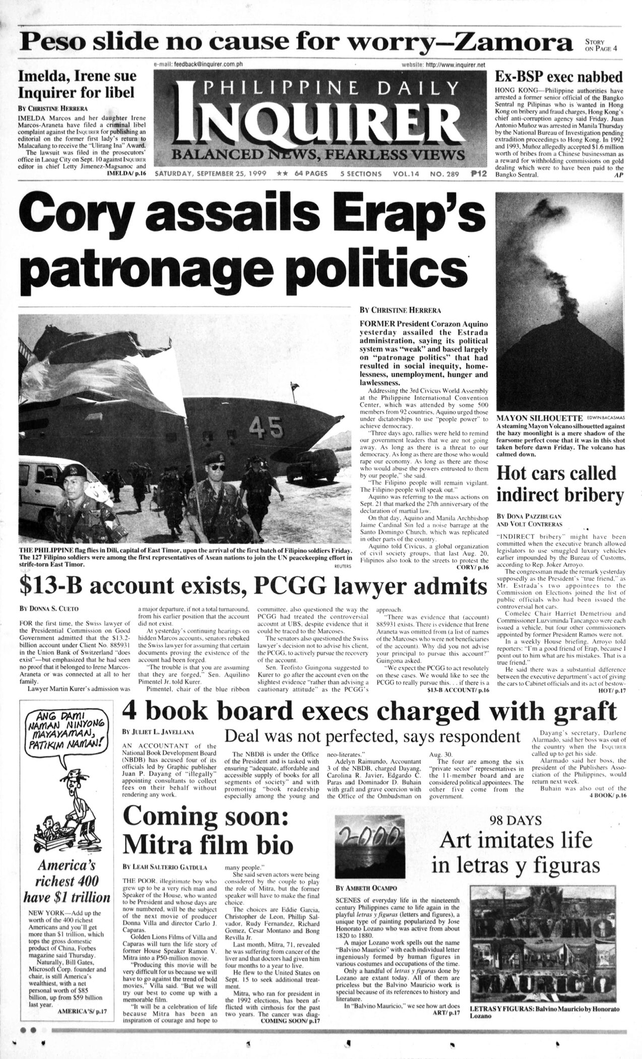 September 25, 1999: Cory assails Erap’s patronage politics by Philippine Daily Inquirer September 25, 2025