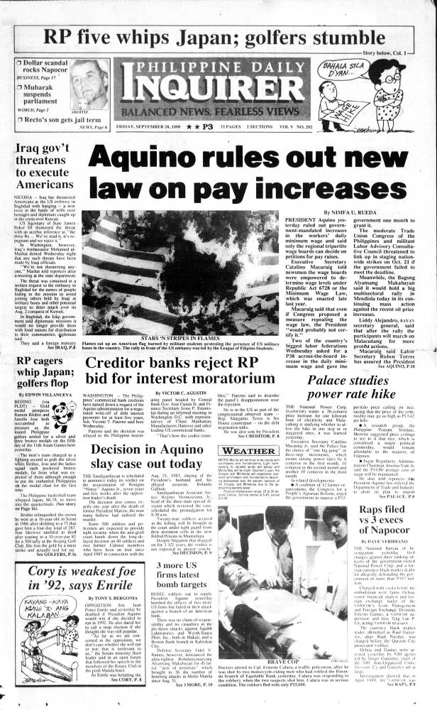 September 28, 1990: Aquino rules out new law on pay increases by Philippine Daily Inquirer September 28, 2025 September 28, 1990.