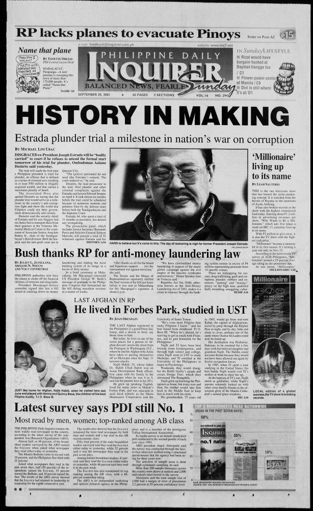 September 30, 2001: History in making: Estrada plunder trial a milestone in nation’s war on corruption by Philippine Daily Inquirer September 30, 2024 September 30, 2001. 0 Comments