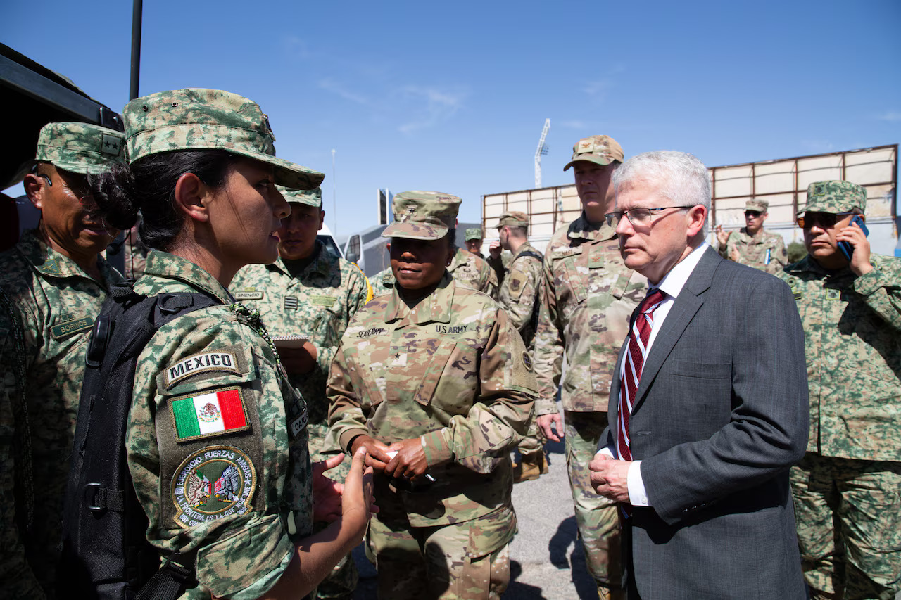 Members of the Mexican military discuss Fuerzas Amigas 2024 with the U.S. Consulate General in Ciudad Juarez, Rafael Foley, right, and Army Brig. Gen. Tomika Seaberry, center, commanding general of the 4th Sustainment Command. --Cathryn Lindsay/AIR FORCE