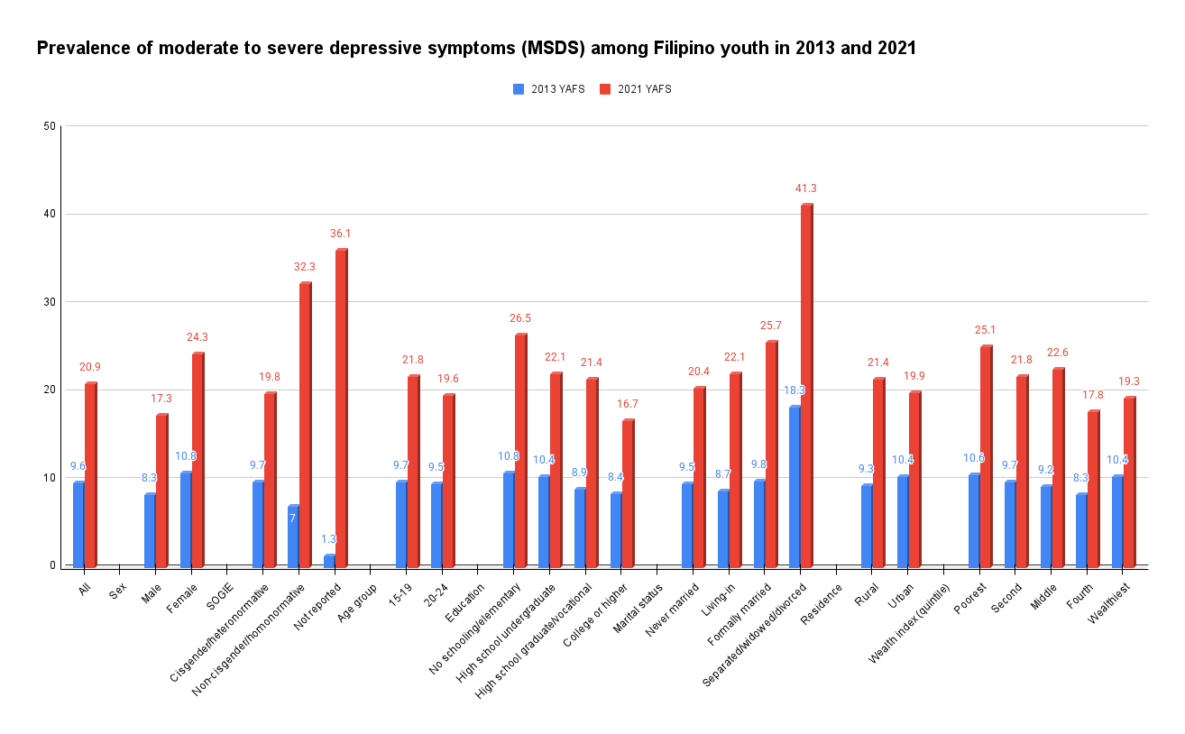 While COVID-19 contributed to the notable increase in the prevalence and sociodemographic disparities in MSDS, it was also deemed likely that depression among Filipino youth was already on the rise before the pandemic.