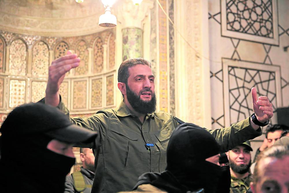 TOPSHOT - The leader of Syria's Islamist Hayat Tahrir al-Sham (HTS) group that headed a lightning rebel offensive snatching Damascus from government control, Abu Mohammed al-Jolani, address a crowd at the capital's landmark Umayyad Mosque on December 8, 2024. Jolani, now using his real name Ahmed al-Sharaa, gave a speech as the crowd chanted "Allahu akbar (God is greatest)," a video shared by the rebels on their Telegram channel showed. (Photo by Aref TAMMAWI / AFP)
