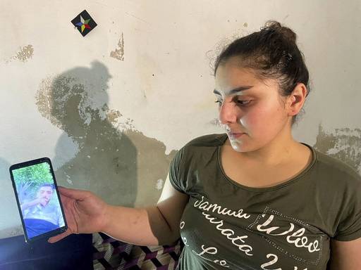 Druze woman, Evelyn Azzam, 20, shows a picture of her husband who was wounded in clashes between Syrian government forces and Druze militias in Sweida, during an interview with The Associated Press in the southern Damascus suburb of Jaramana, Wednesday, July 16, 2025. (AP Photo/Abdulrahman Shaheen)