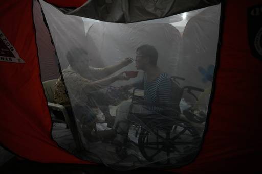 Judy Bertuso, 63, leans forward inside a bright orange tent set up on the floor of a basketball court in Quezon City, carefully spooning porridge into her husband Apollo’s mouth.